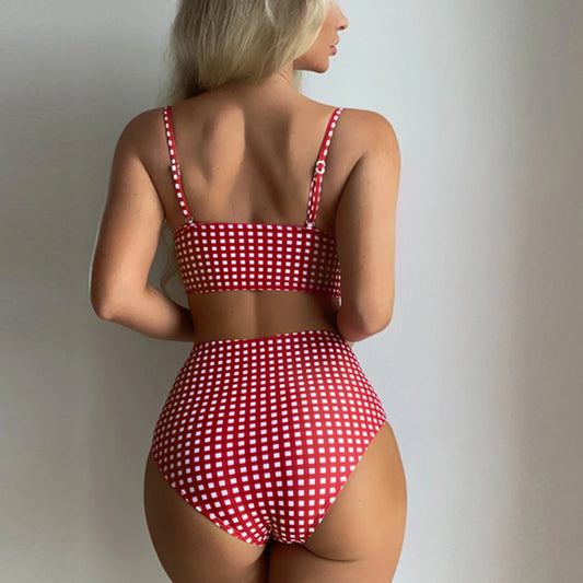 Summer Checkered Printing Bikini Set Sling Push Up Thin Shoulder Straps Separate Two-Piece Swimsuit High Waist Women'S Swimwear