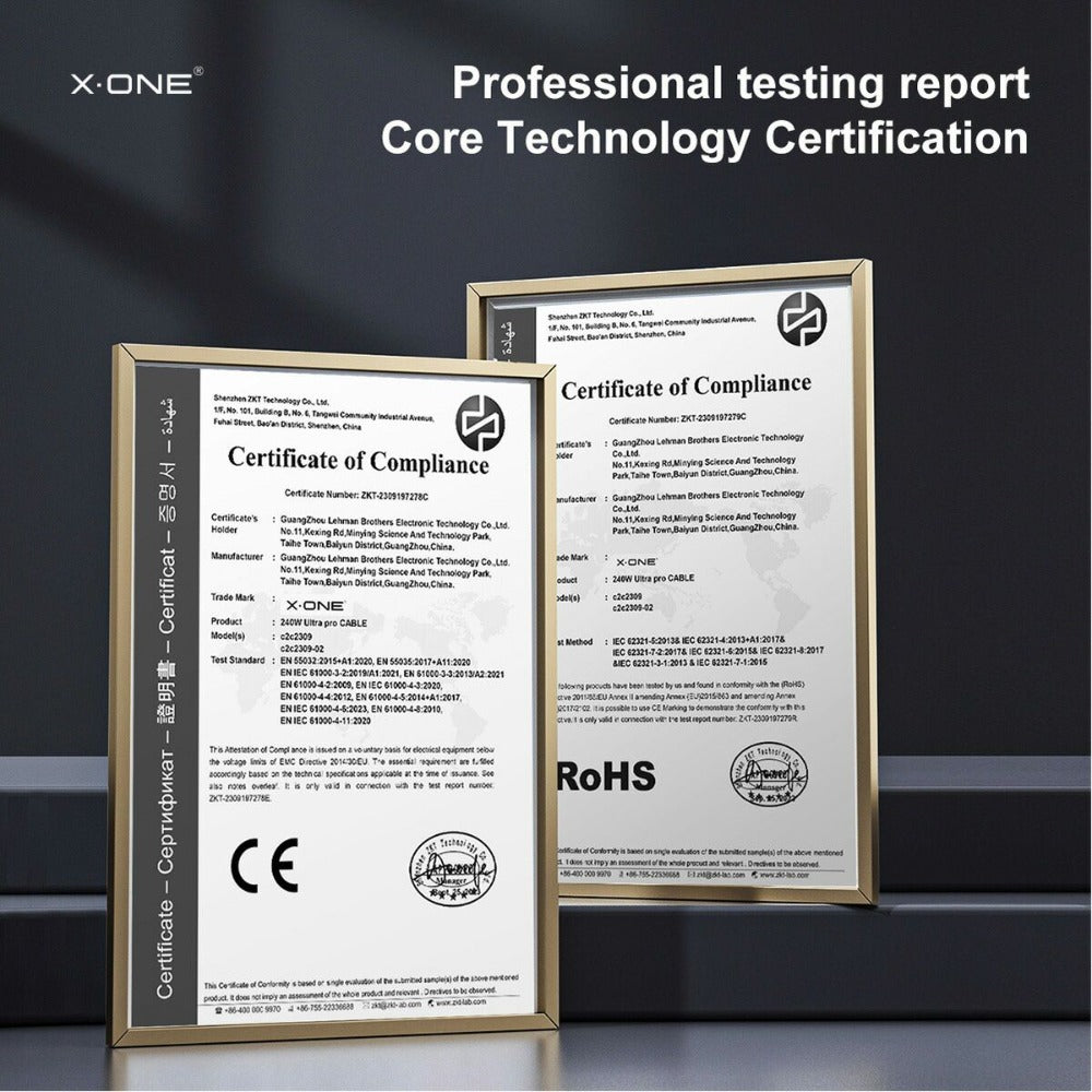 XONE's new 240W dual Type-C fast charging cable uses a nylon braided cable that does not shed lint, which is resistant to bending and not breaking. It features oxidation-resistant, corrosion-resistant forged interfaces for long-lasting durability. Built-in E-MARK certified chip, stable power supply, no damage to the device. Available on Apple products with 600% faster speeds. The new 240W nylon cable certified chip supports fast charging for iPhone 15 and 16 series.