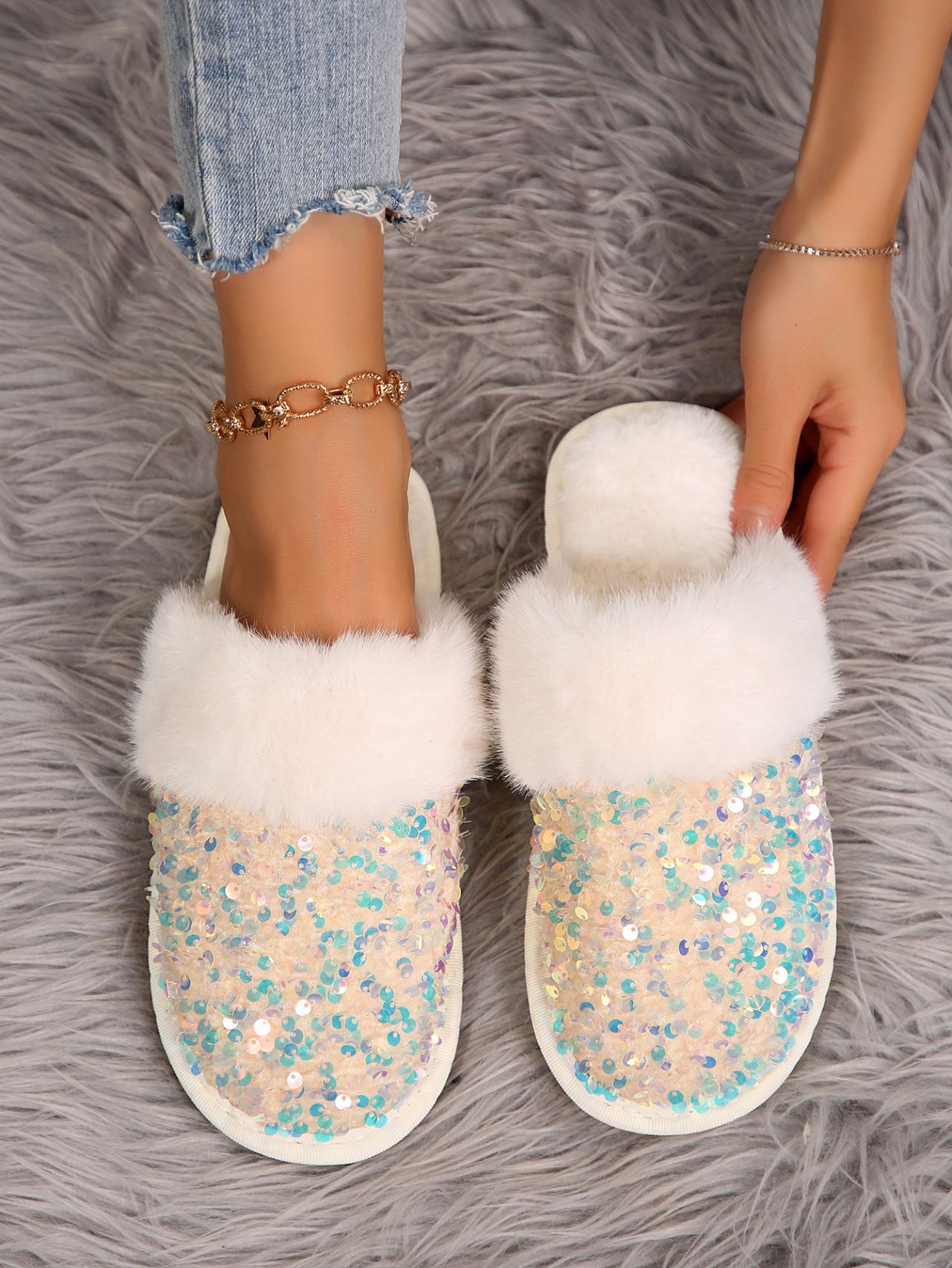 Sequin Flat Plush Slippers For Women